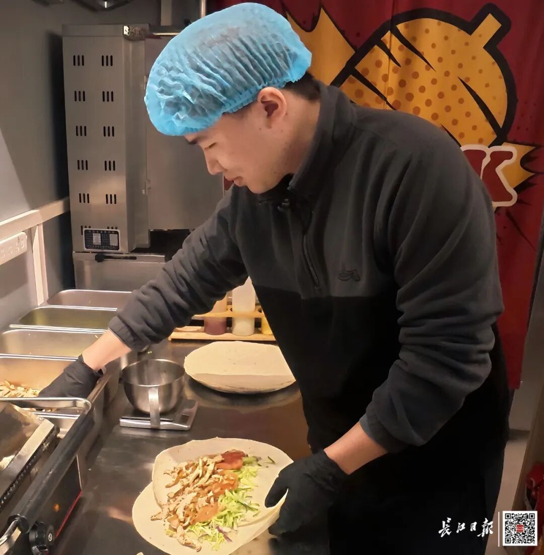 张麒标的创业始于一次偶然。2023年7月,回国后的他来武汉找高中同学过暑假。“朋友说财大美食街有个空档口,问我要不要试试。”抱着玩票心态,他想起留学时最爱的街头小吃——沙威玛,“在俄罗斯,这东西遍地都是。制作相对简单,但风味独特”。