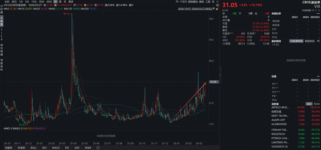 此外,现金的可得性、流动性偏好的趋势项也会投射到股市的波动率之中,如上图所示,自去年年底,vix指数持续攀升,已经来到了31的高位。如果后续vix指数进一步攀升,那么,美股很容易出现2025年4月份那种动荡,vix指数奔着60大关去了。